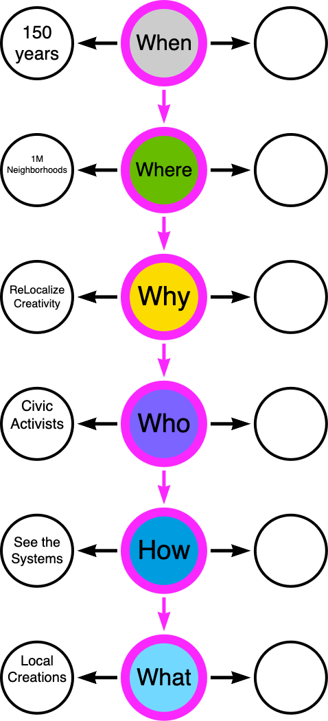 It is loosely based upon Donella Meadows Leverage Points Paper. He always starts with Why? or Purpose, followed by When, Where, Who, How, and finally What. There is an opportunity for endless recursions and iterations.